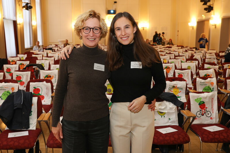 Das Projektteam »Gesund aufwachsen im Landkreis Oberhavel« lächelt vor Beginn der 3. Kinder- und Jugend-Gesundheitskonferenz in die Kamera, im Hintergrund ist der Veranstaltungssaal zu sehen.