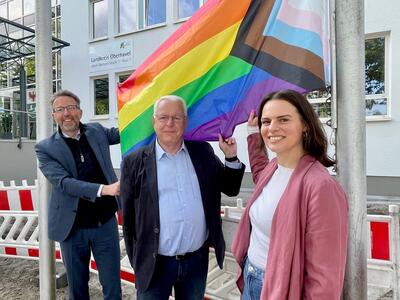 Ein sichtbares Zeichen für Vielfalt und Toleranz war am Mittwoch, 17.05.2023, vor der Kreisverwaltung und vielen weiteren öffentlichen Gebäuden in Oberhavel zu sehen: Anlässlich des Internationalen Tages gegen Homophobie, Transphobie und Biphobie haben Landrat Alexander Tönnies, der stellvertretende Kreistagsvorsitzende Dirk Blettermann und Valérie Stroh vom Gleichstellungsbüro Oberhavels eine Regenbogenflagge gehisst. Die Flagge wehte bereits zum fünften Mal vor dem Hauptgebäude der Kreisverwaltung.
