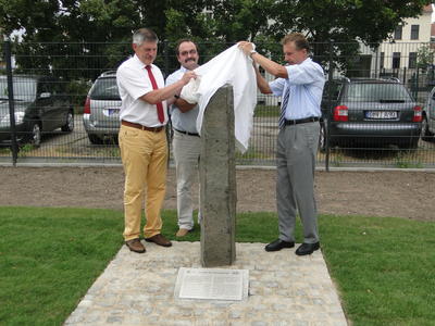 Der neue Landrat des Vogelsberkkreises, Manfred Görig, Oberhavels Landrat, Karl-Heinz Schröter und Schulleiter des Runge Gymnasiums Uwe Seidler enthüllen eine Basaltstele aus dem Vogelsbergkreis.