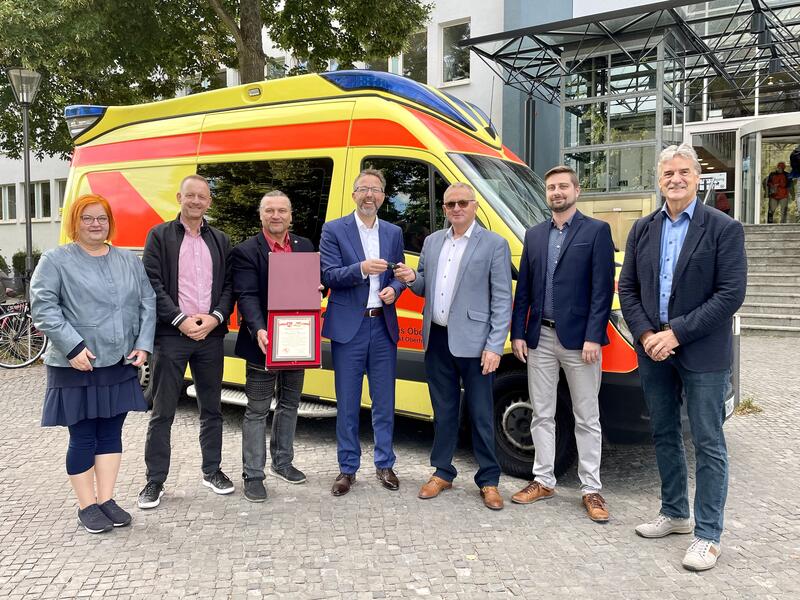 Ein ausgemusterter Rettungswagen ging am Freitag, 02.09.2022, von Oberhavel aus auf den Weg nach Polen. Landrat Alexander Tönnies sowie die Dezernenten Egmont Hamelow und Matthias Rink übergaben das Fahrzeug am Morgen an Vertreter aus Oberhavels polnischem Partnerlandkreis Biala Podlaska. Von den polnischen Partnern gab es dafür eine Dankesurkunde.