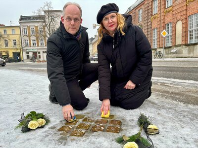 Oberhavels Bildungsdezernent Holger Mittelstädt und Oranienburgs Bürgermeisterin Jennifer Collin-Feeder haben gemeinsam im Gedenken an die Familien Lauter und Mathias Stolpersteine an der Havelstraße 10 geputzt. Während einigen Familienmitgliedern in den 1940er-Jahren die Flucht ins Ausland gelang, starben andere in Konzentrationslagern und im Warschauer Ghetto. Stolpersteine erinnern an die Opfer des Nationalsozialismus: in Fürstenberg, Gransee, Neuglobsow, Zehdenick, Liebenwalde, Freienhagen, Liebenberg, Kremmen, Oranienburg, Hohen Neuendorf, Borgsdorf, Bergfelde, Glienicke, Hennigsdorf, Velten und Schwante. Infos zu den Stolpersteinen in Oberhavel sind unter remo.oberhavel.de/stolpersteine zu finden. Die Stolpersteine sind ein Projekt des Bildhauers Gunter Demnig. Sie erinnern dort an die Menschen, wo sie zuletzt gelebt haben. Infos zum Projekt gibt es unter www.stolpersteine.eu.