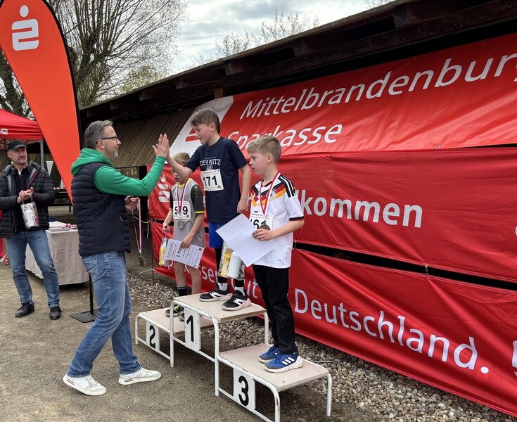 Landrat Alexander Tönnies (li.) ehrt die jungen Gewinner. Unterstützt vom Förderverein für Schulsport Oberhavel, der Mittelbrandenburgischen Sparkasse (MBS) und dem Landkreis finden die Läufe seit 24 Jahren vor historischer Kulisse des Ziegeleiparks statt.
